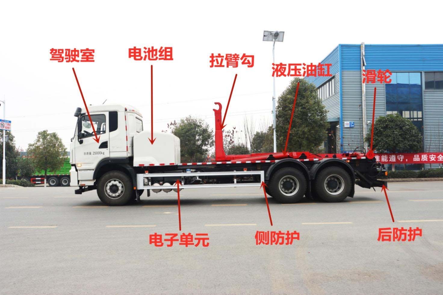 一、底盤配置: 采用東風(fēng)DFH1180BEV1車身,配置玉柴TZ370XS-LKM1103發(fā)動機(jī)160馬力,國六排放標(biāo)準(zhǔn),軸距4500,4700(mm),整備質(zhì)量9.5噸,額定載質(zhì)量8.37噸,五擋變速箱,帶動力轉(zhuǎn)向,帶原廠空調(diào),ABS 型號:J ABS;ABS 生產(chǎn)企業(yè):焦作博瑞克控制技術(shù)有限公司;儲能裝置單體種類/生產(chǎn)企業(yè): 磷酸鐵鋰蓄電池 /寧德時代新能源科技股份有限公司;儲能裝置總成的生產(chǎn)企業(yè):寧德時代新能源科技股份有限公司;驅(qū)動電機(jī): TZ370XS-LKM1103,功率(KW):160;側(cè)面防護(hù)裝置材料采用鋁合金,連接方式為螺栓連接,后防護(hù)裝置材料為 Q235 A,連接方式為螺栓連接,后部防護(hù)裝置的斷面尺寸為:60×120(mm),離地面高度 450mm;專用功能及裝置:液壓 缸、拉臂鉤等專用設(shè)備,實(shí)現(xiàn)對垃圾的該車上黃牌,城區(qū)道路請注意限行標(biāo)識。