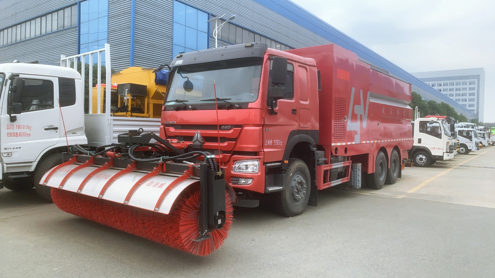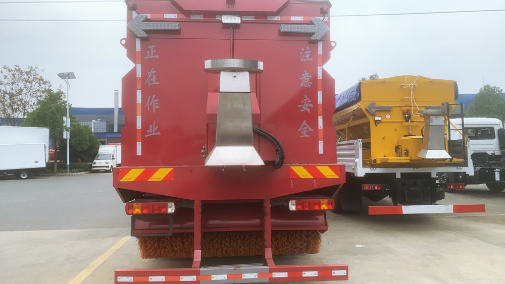 四、其他說明: 該車用于冬季撒布融雪劑;主要專用裝置為撒布機、破冰機、雪鏟和滾刷; 僅采用4625+1350mm軸距底盤,整車長為10680mm時,前伸為180mm; 側后防護材料均為Q235,均采用螺栓連接,后防護截面尺寸150mm×50mm,下邊緣離地高350mm,選用輪胎型號:11.00R20 18PR,12.00R20 16PR; 該車安裝有工作警示燈,后部箭頭燈僅在作業狀態下開啟; 后懸架僅采用鋼板彈簧懸架.
